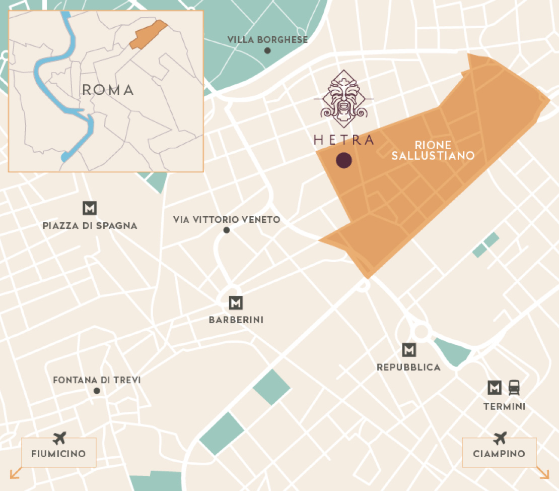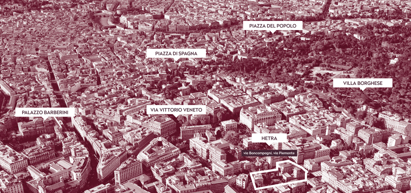 Il complesso Hetra sorge nel centro storico della città, all’interno del Rione Sallustiano, il quartiere delimitato da Porta Pia, via Boncompagni, via Bissolati e via XX Settembre.